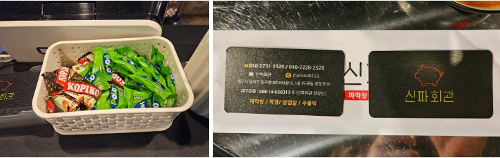 가게 연락처와 화한 폴로캔디와 커피캔디를 입가심으로 먹어줍니다.