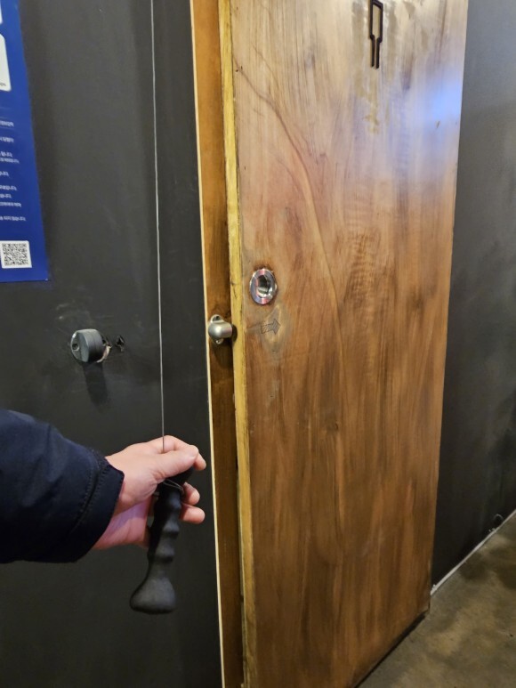여기 화장실 문은 좌우로 스르륵 열리는 형태입니다.