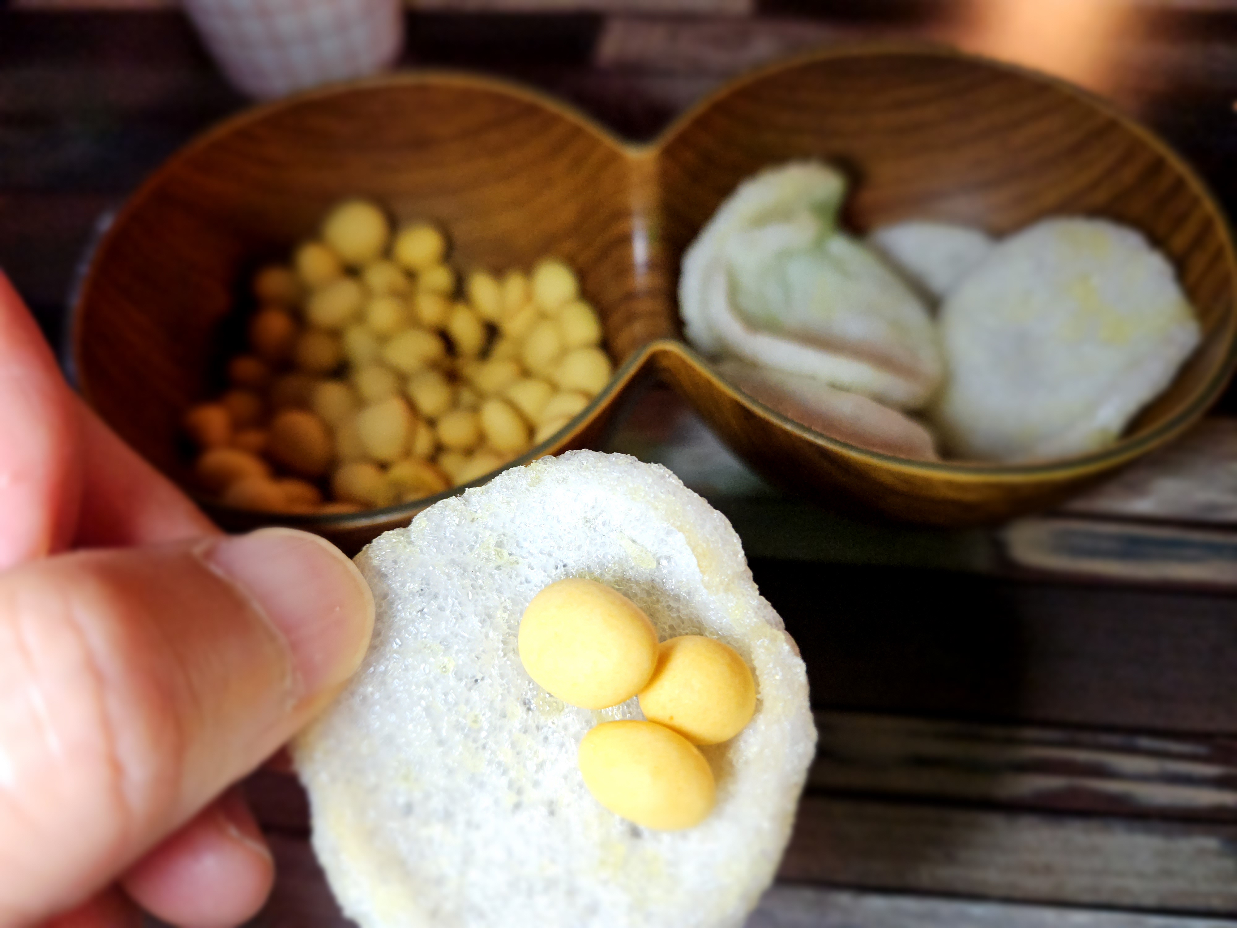 뻥튀기 같은 감자칩과 새끼 오징어땅콩 느낌의 피쉬볼 같습니다.